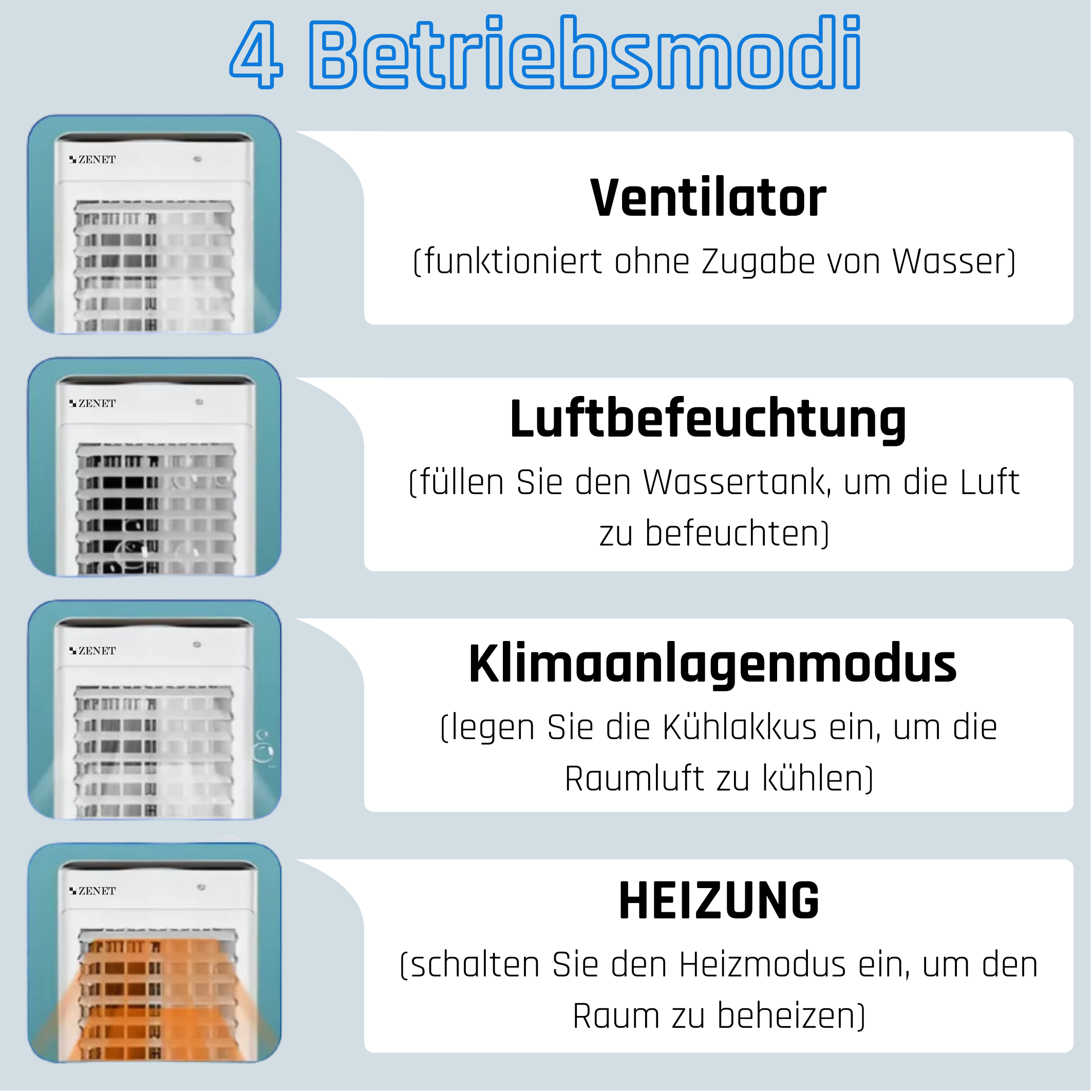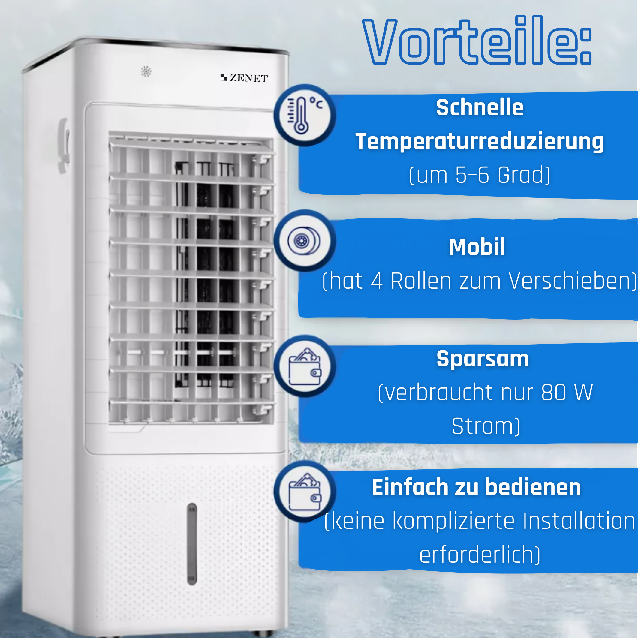 Die Mini-Raumklimaanlage ZET-480 ist die ideale Wahl für alle, die Wert auf Komfort, Qualität und Effizienz legen. Es schafft nicht nur eine angenehme Atmosphäre in Ihrem Zuhause oder Büro, sondern sorgt auch für Ihre Gesundheit, indem es die Luft reinigt und ionisiert. Genießen Sie jeden Tag frische und saubere Luft!