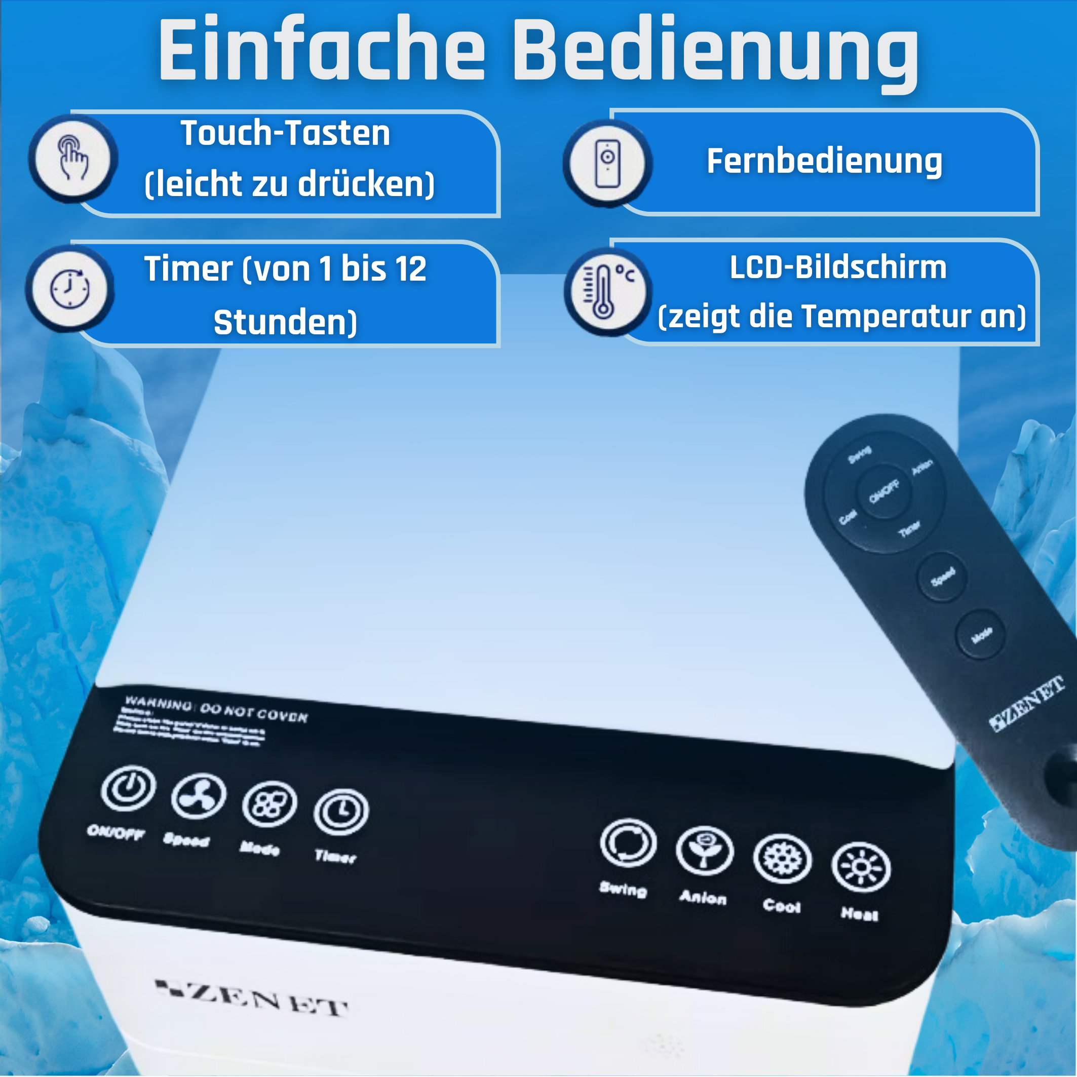 - Fernbedienung: Mit der Fernbedienung können Sie alle Funktionen des Luftkühlers bequem steuern.