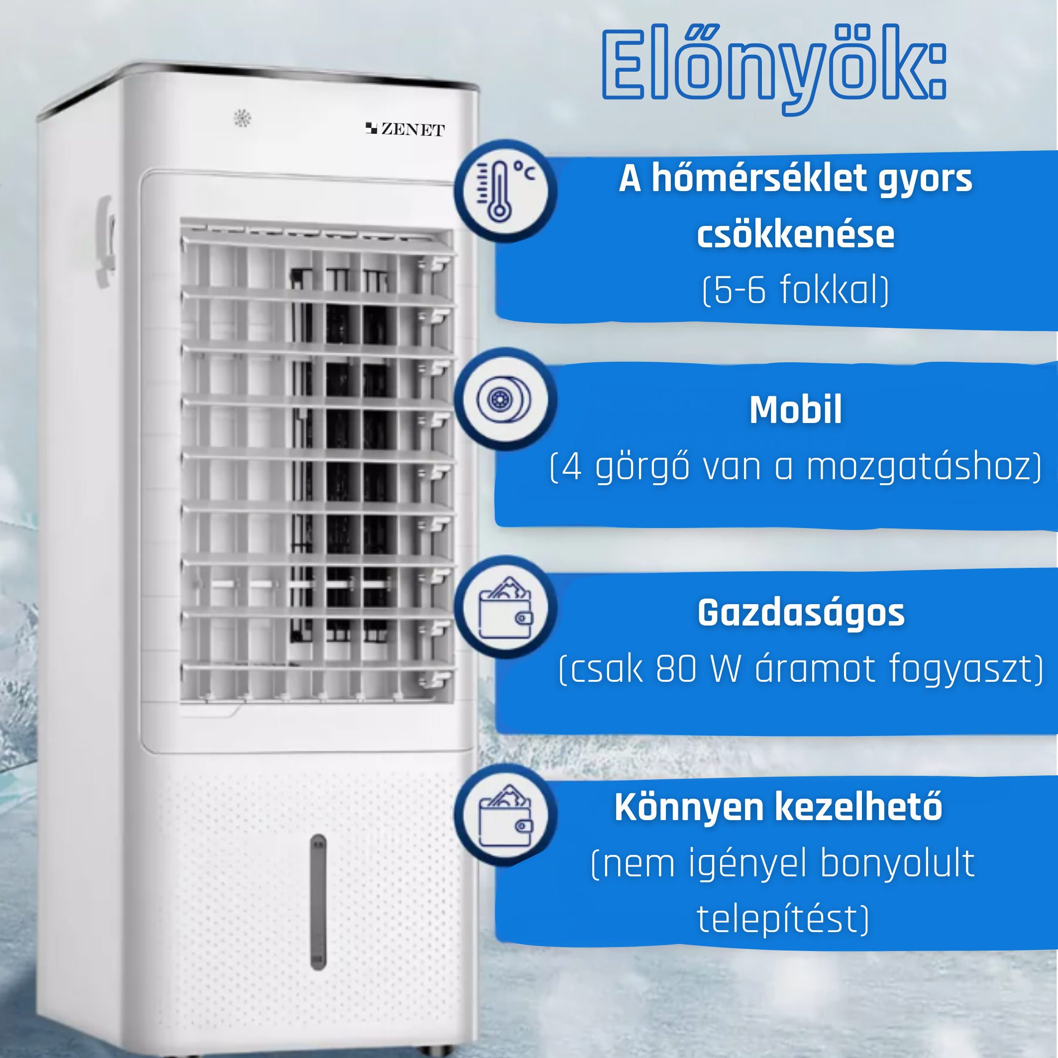 - Hűtés: 6-7 fokkal csökkenti a hőmérsékletet az eredeti hűtéshez képest, a mellékelt hűtőközeg (6 literes víztartály) használatával.