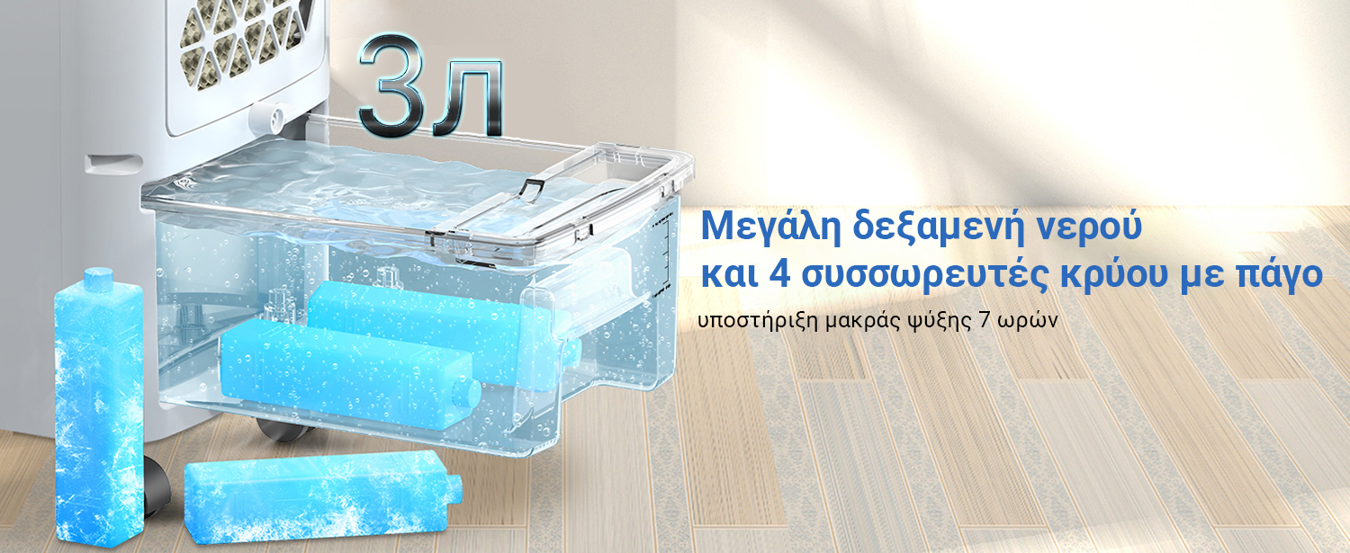 είναι η απόλυτη λύση για την ψύξη και ανανέωση του αέρα στο χώρο σας. Συνδυάζει ψύξη, ύγρανση και καθαρισμό σε μία συσκευή, χωρίς ανάγκη για εξωτερική εγκατάσταση. Με δεξαμενή νερού 3 λίτρων, χαμηλή κατανάλωση ρεύματος 65W και τέσσερα επαναχρησιμοποιούμενα παγοκύστες, προσφέρει ευχάριστη θερμοκρασία και ποιότητα αέρα σε κάθε εποχή.