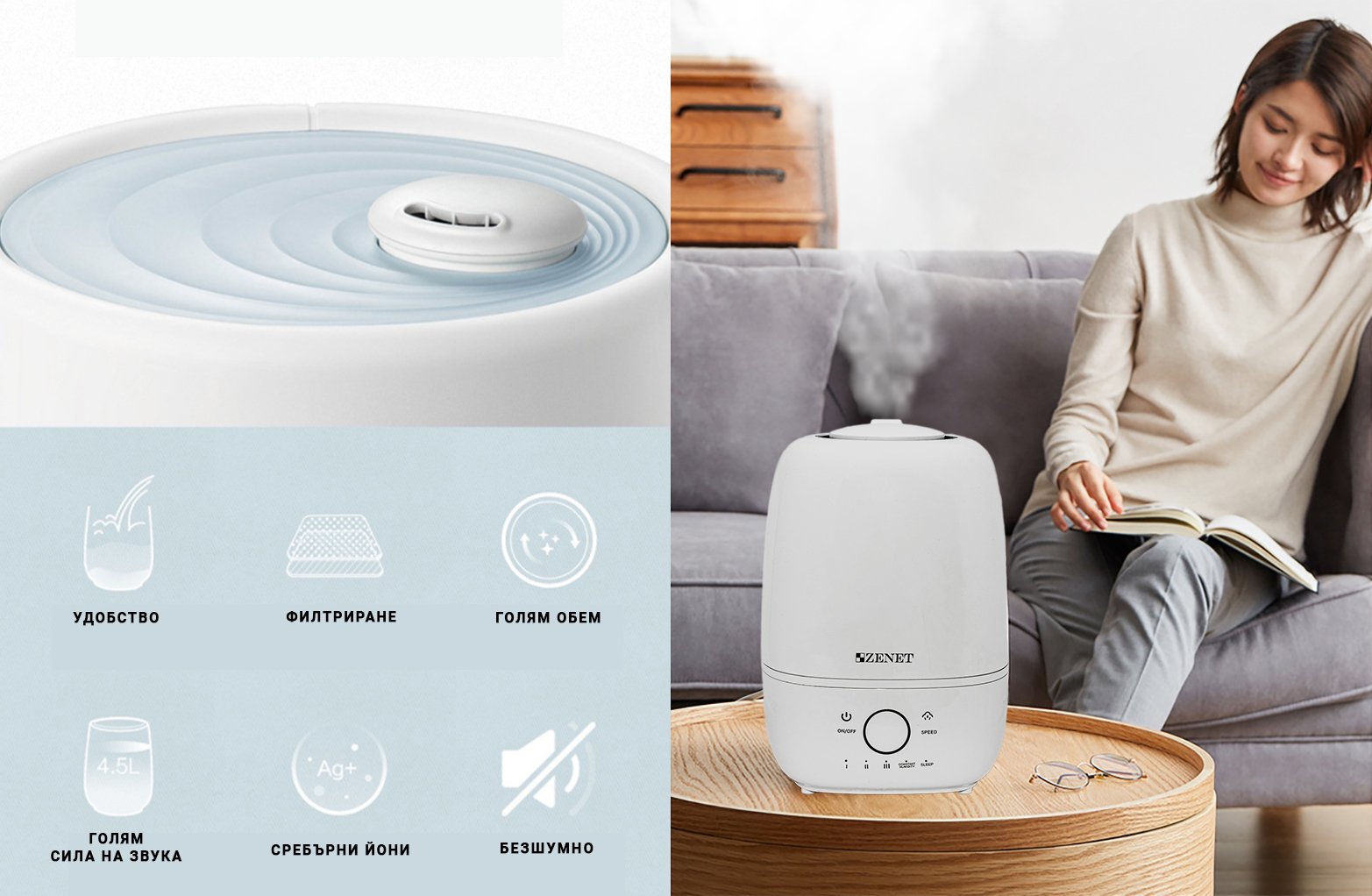 Арома овлажнител Zenet ZET-409 с вместимост 4,5 л. е климатичен уред, използван предимно за повишаване на влажността на въздуха в помещенията и поддържане на оптимално ниво на влажност, комфортно за дихателната система.