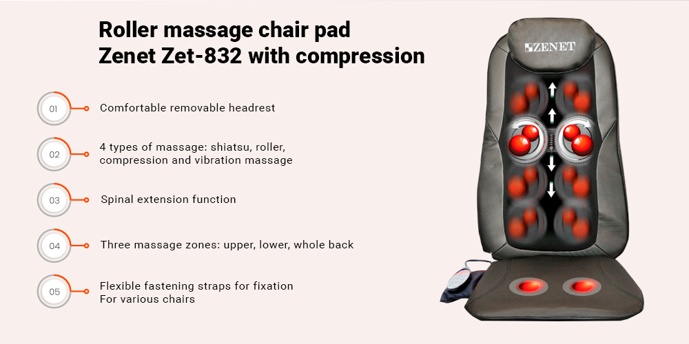 Thanks to the unique combination of several types of massage techniques in this model of massage roller pad, you can easily cope with various ailments. Buy massage chair pad Zenet Zet-832 to enjoy a great massage every day at home or at work. With this massager, you will quickly notice how much brighter your everyday life will become, how much more energy will appear in the body.