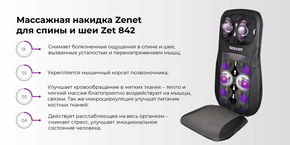 Дизайн накидки продуман до мелочей, а пульт управления позволяет использовать все возможности устройства по максимуму. Рекомендуем купить массажную накидку Zenet для спины и шеи Zet 842 и наслаждайтесь массажем в любое время.