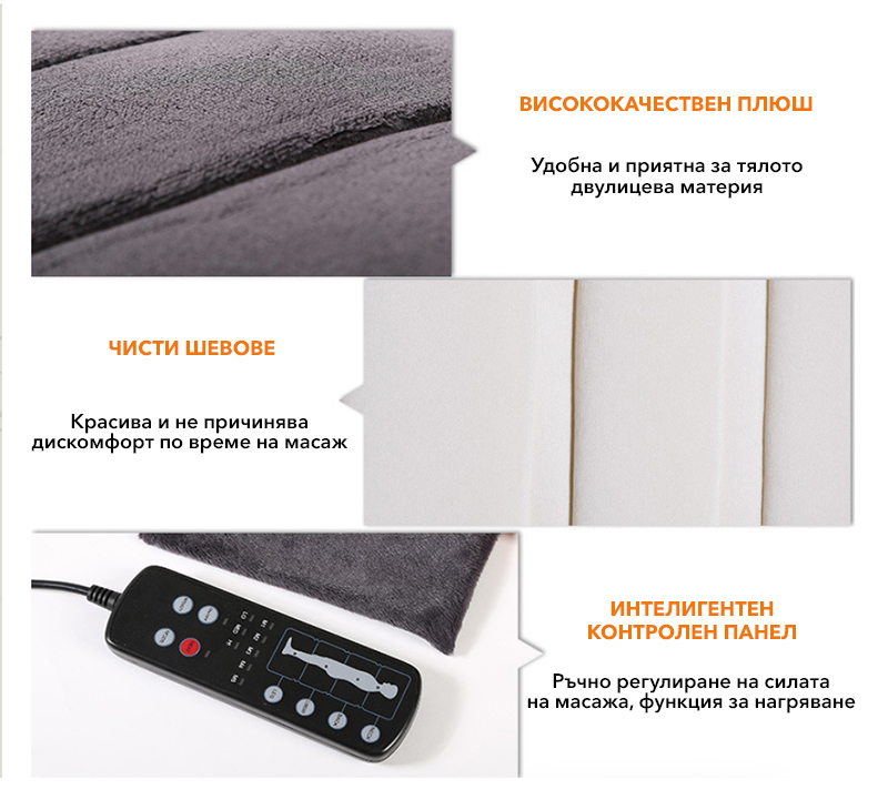 Масажира едновременно или поетапно всички зони, има загряващ ефект, може да се постави на легло, кресло, диван или стол.