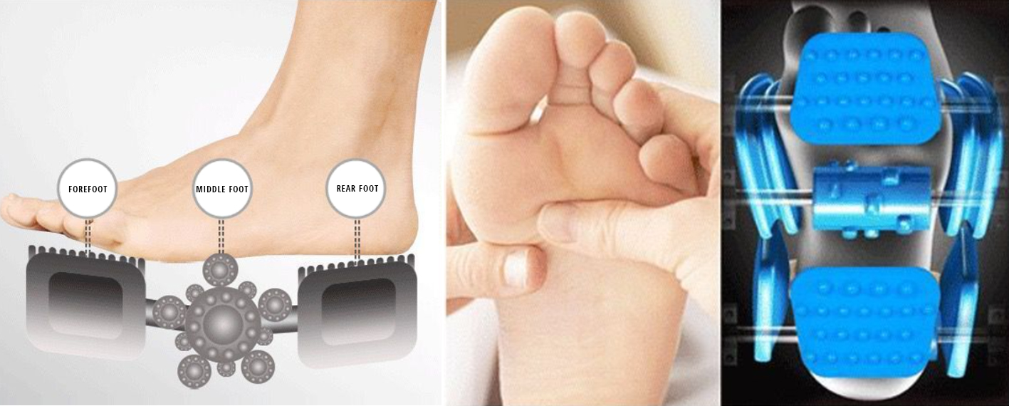 2. Multi-sectional roller along the arch of the foot acts from the bottom of the foot