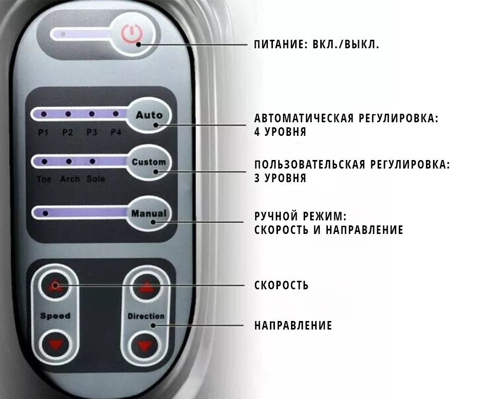 Комплектация: массажер для стоп и лодыжек, пульт управления, инструкция на русском языке, гарантийный талон на 24мес.