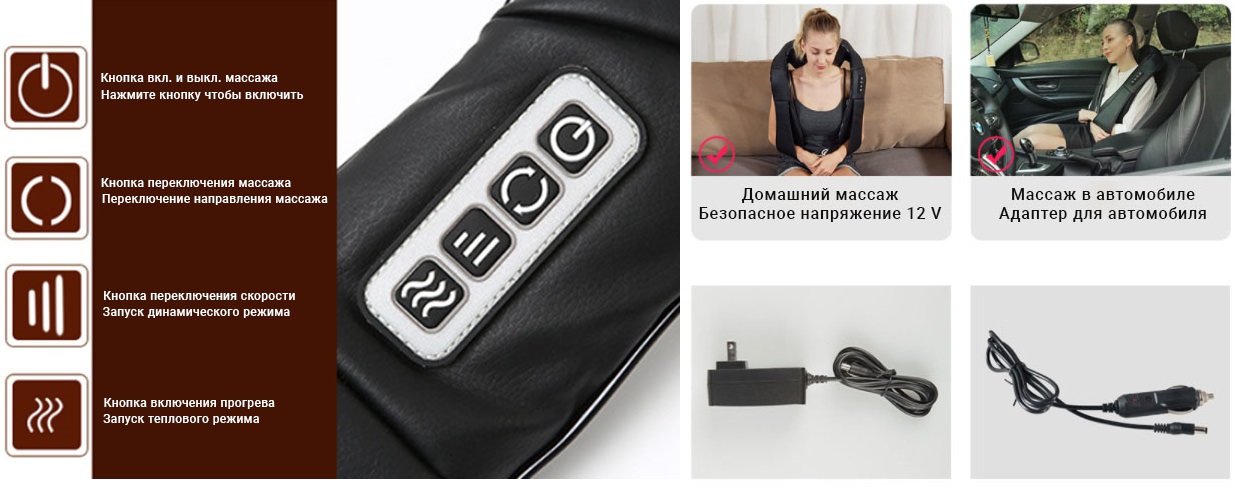 Массажер подключается в розетку или автомобильный прикуриватель с помощью адаптеров из комплекта.