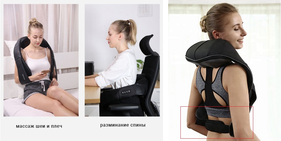 Массажер сделан в виде накидки на плечи и имеет анатомическую форму – повторяет контуры тела.