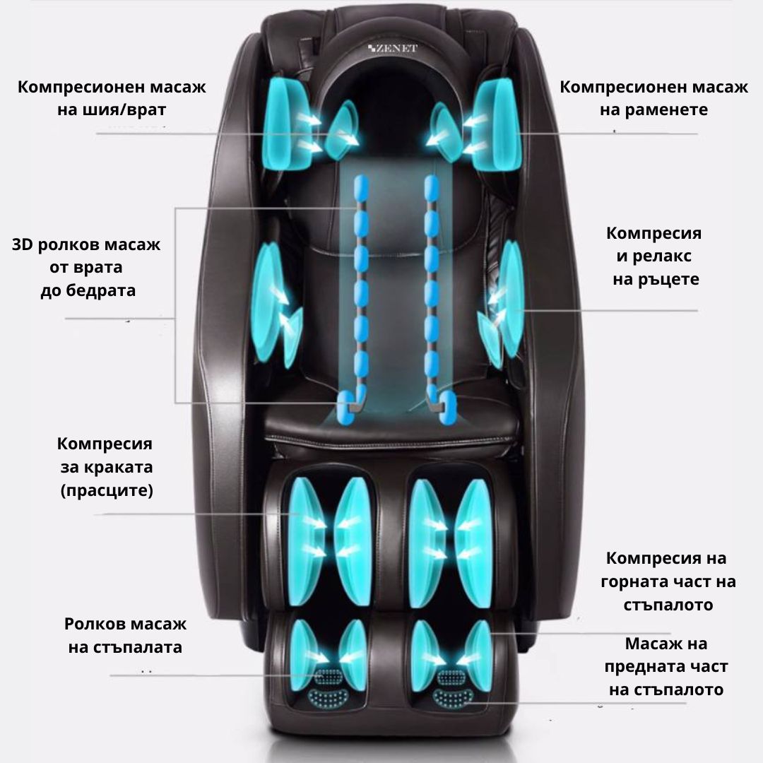 Допълнително, ZENET ZET-1288 е оборудван с иновативна система за масаж на стъпалата - тя използва ролки и въздушни възглавници, които облекчават умората и подобряват кръвообращението – това е особено полезно за хора със заседнал начин на живот.